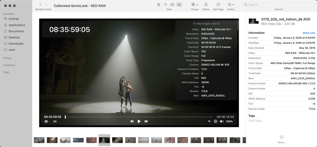 Calibrated QuickLook is a free macOS extension powered by a streamlined version of the Tin Man Decoding Engine for high-quality playback and accurate color reproduction. Once installed – it enables Finder to play previews and display thumbnails for BRAW, R3D, MXF* and more professional camera RAW formats.