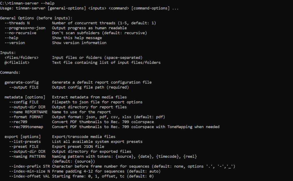 tinman-server --threads 3/path/footage/ metadata --output-dir /path/reports/ --format csv pdf xlsx